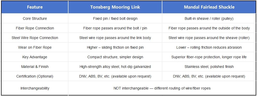 Both the Tonsberg Mooring Link and the Mandal Fairlead Shackle are specialized mooring connectors used to join steel wire ropes with fiber rope forerunners, allowing the combined mooring line to pass smoothly through a fairlead. While they serve the same fundamental purpose, they have significant differences in structural design and application scenarios, and they are NOT interchangeable.
